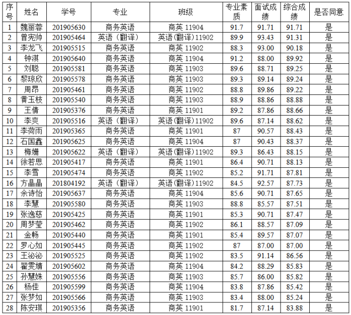 学生本人申请、学院资格审核、面试考查、综合成绩评定现将我院2019级商务英语专业“卓越国际人才”实验班拟录取名单予以公示