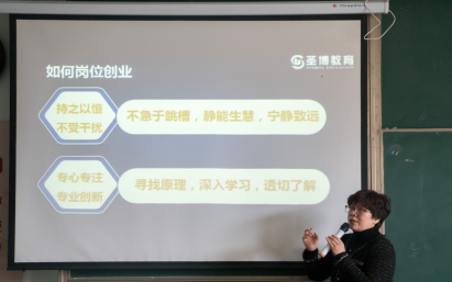 首先张涛老师介绍校长以及圣博教育,随后刘校长正式开始向同学们分享自己的经验。关于读研与否的问题,她表示,这是两条截然不同的路,选择考研就是要做专业性、研究性人才进入社会就是要实际地通过工作来学习与提升,无论走哪条路,都要有终身学习的理念,放弃“吃老本”的想法。她的第二个重点就是告诉同学们如何高效就业,并从两个角度阐述了这个问题。从企业的选择上来看,一个好的企业应具有核心竞争力、领导人开拓创新、规模适中,提速发展四个质。从求职者本身来看,新人求职应该必备抛弃幻想,抓住机会、脚踏实地、注重细节以及参考专业五个原则。紧接着,刘校长讲述了如何岗位创业她表示,只有做到持之以恒,不受干扰,专心专注,专业创新才能岗位成才。