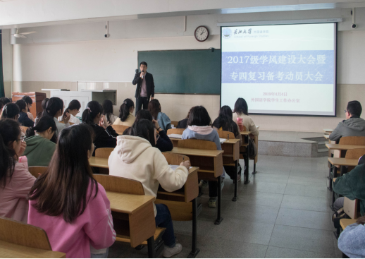 (文/李文佳 摄/吴一楠)4月4日下午两点,我院于12教-402举行了2017级年级大会。本次大会主要围绕学风建设以及专四复习备考动员两个方面展开,由车桥老师主持,院党委副书记张涛老师、马欣老师、张晓莉老师、雷难老师、龚频老师、李福兴老师、16级翟倩和周梦悦同学以及2017级354名本科生参加。