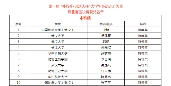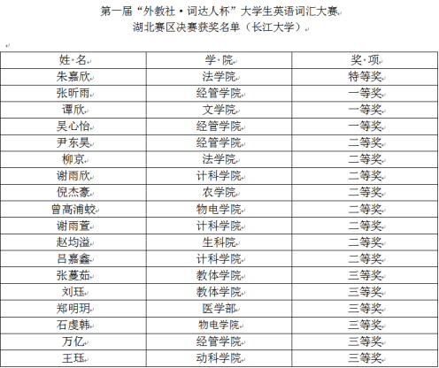 (通讯员:罗博)5月28日晚,第一届“外教社·词达人杯”大学生英语词汇大赛湖北省赛区决赛圆满落幕,我校共有20名非英语专业学生参加决赛,17名同学摘得奖项。法学院法学类31904班的朱嘉欣同学喜获本科组特等奖,3名同学获一等奖,8名同学获二等奖,5名同学获三等奖。我校获奖人数和质量居省属高校前列,长江大学荣获“优秀组织奖”,开云·官方端网页版登录入口李琼华老师被评为“优秀指导老师”。