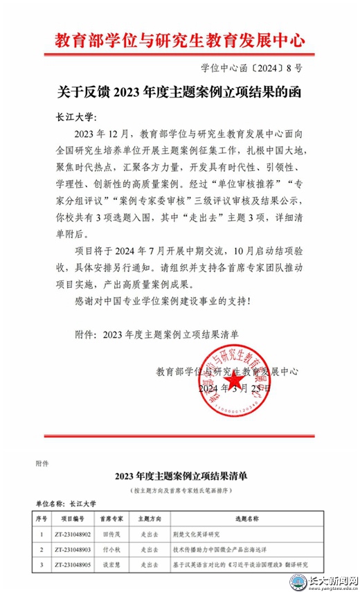 本次获批的3项主题案例分别是谈宏慧教授担任首席专家的《基于汉英语言对比的〈习近平谈治国理政〉翻译研究》、田传茂教授担任首席专家的《荆楚文化英译研究》、付小秋博士担任首席专家的《技术传播助力中国微企产品出海远洋》。三位老师积极响应教育部学位与研究生教育发展中心征集主题案例的核心目标,结合开云·官方端网页版登录入口翻译硕士人才培养的实际需求和教学经验,围绕“走出去”主题,聚焦中国“产品走出去”“教育走出去”“文化走出去”的问题,总结中国经验、讲好中国故事,为建构中国自主知识体系提供案例视角,获得了教育部专家评委的一致认可。