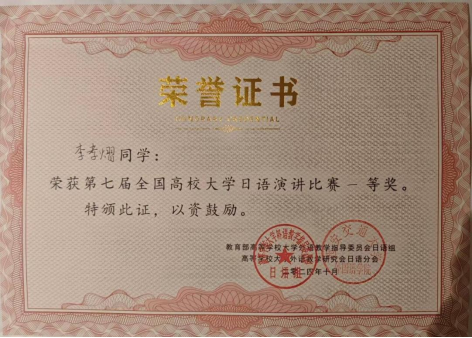 据悉,全国高校大学日语演讲赛由教育部高等学校大学外语教学指导委员会日语组、高等学校大学外语教学研究会主办。这是我校非日语专业学生第二次获得大学日语演讲赛全国一等奖。