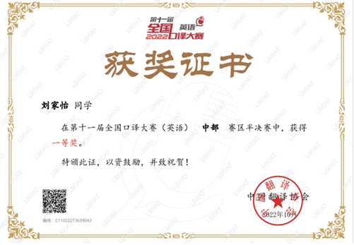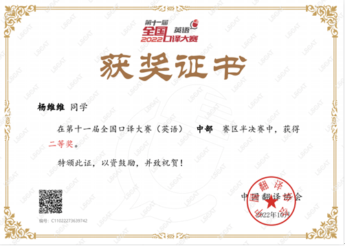(通讯员 赵宇杰)日前,由中国外文局指导、中国翻译协会主办的第十一届全国口译大赛(英语)交传半决赛落下帷幕。开云·官方端网页版登录入口英语笔译QZ211班研究生刘家怡、杨维维2名同学分别获得中部赛区一等奖和二等奖。其中,刘家怡获晋级全国总决赛交传赛资格。
