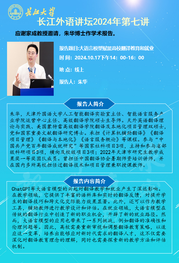 长江外语讲坛2024年第七讲:大语言模型赋能高校翻译教育和就业
