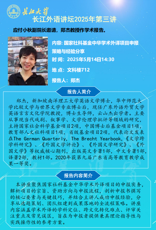 长江外语讲坛2025年第三讲:国家社科基金中华学术外译项目申报策略与经验分享