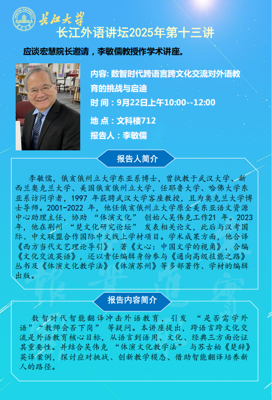 长江外语讲坛2025年第十三讲:数智时代跨语言跨文化交流对外语教育的挑战与启迪